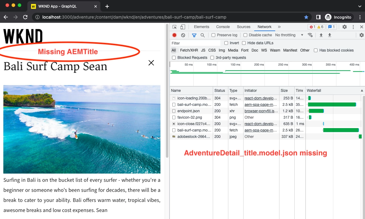 I am following this Remote SPA tutorial, and added a Fixed `AEMTitle` component to the AdventureDetail.js component below.