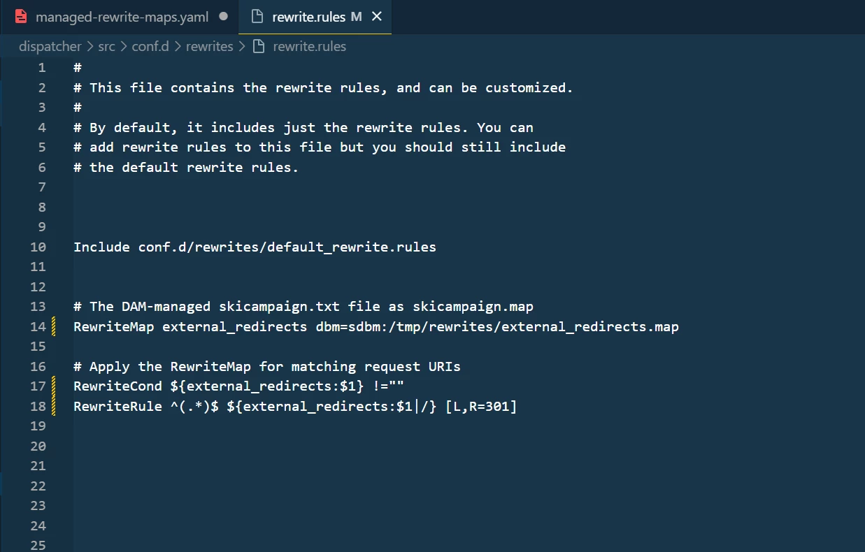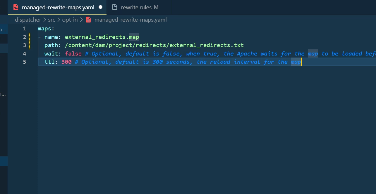 I’m trying to implement 301 redirects using RewriteMap in AEM Dispatcher. I’ve followed Adobe’s documentation on pipeline-free URL redirects, and everything seems to be in place — except the redirects aren’t working.