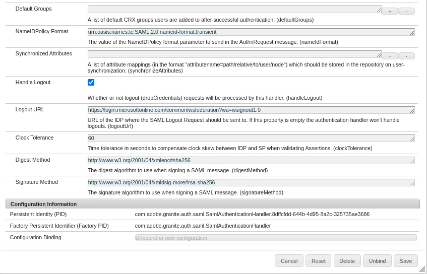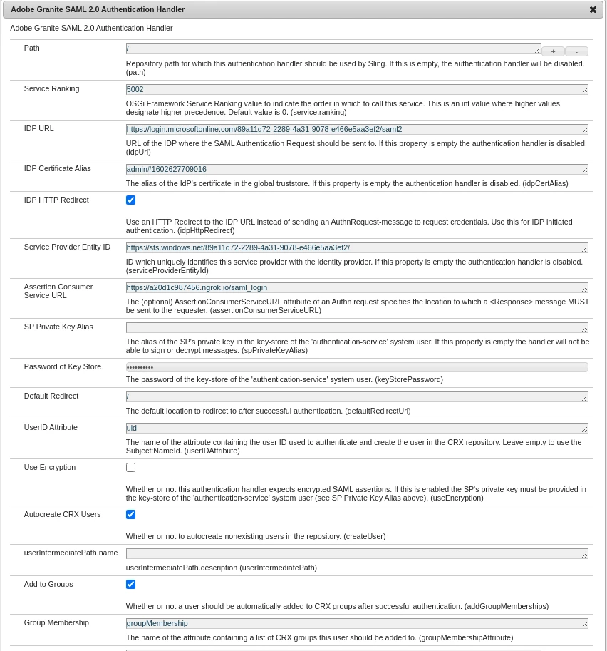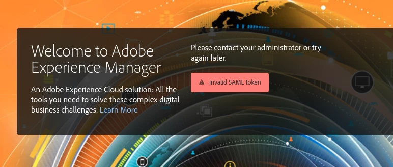 com.adobe.granite.auth.saml.util.SamlReader Signature verification failed. No signature. com.adobe.granite.auth.saml.model.Assertion Invalid Assertion: audienceRestrictions violated. com.adobe.granite.auth.saml.SamlAuthenticationHandler Login failed. SAML token invalid. com.adobe.granite.auth.saml.SamlAuthenticationHandler SAML error with reason: invalid_token detected, redirect user to: /libs/granite/core/content/login.error.html?j_reason=invalid_token