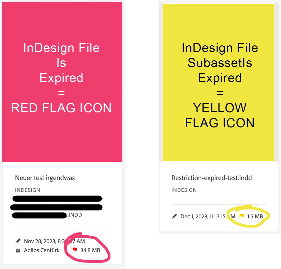 | Anwendungsfall: | The red flag icon on the thumbnail warns that an Asset is expired. This red flag indicates that a file can not be downloaded. BUT this warning is used by the system for two different occasions. AssetExpired and SubAssetExpired. An InDesign file might contain an expired picture. Now that InDesign file will be displayed with a red flag. But the InDesign file itself is not expired and can be downloaded. Therefore i suggest that there needs to be a better differenciation. Visualy as well as for the expiry search filter. |