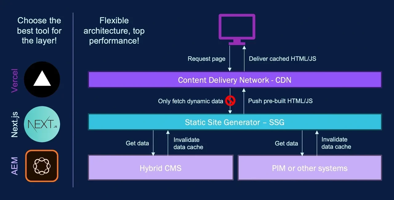 A JAMstack architecture focuses on pre-building all HTML/JS files, so only a small percentage of user requests need to reach the backend servers. The pre-built content is pushed to a CDN like Vercel to achieve maximum performance. This approach also enables clients to choose different state-of-the-art solutions for their different layers. Therefore, we can avoid vendor lock-in across layers and keep our architecture future-proof and flexible.