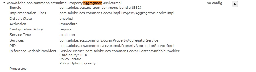 I also cheched the configMgr console page, and I can't see the PropertyAggregatorServiceImpl service. I can only see com.adobe.acs.commons.ccvar.impl.PropertyConfigServiceImpl:
