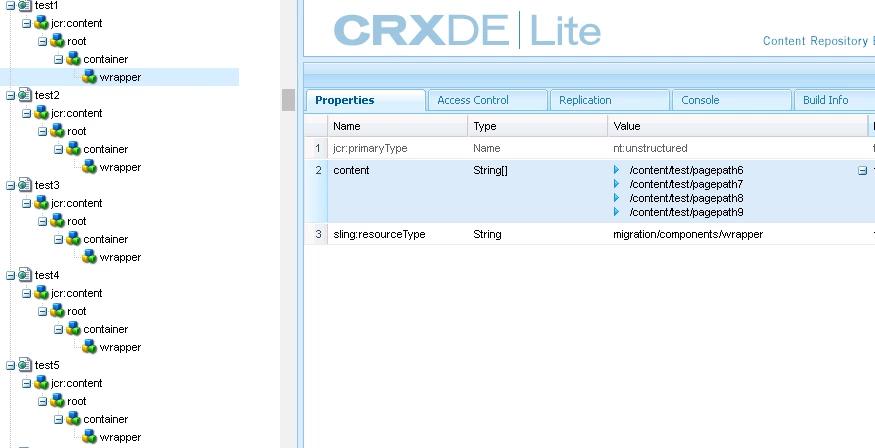 Now fetch all the pages with particular template and get the property value of content which is String[] under /content/project/website/en-us/test1/jcr:content/root/container/wrapper