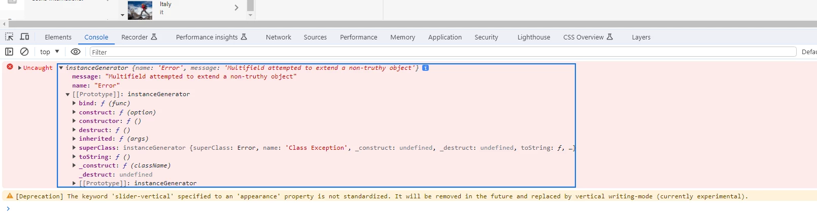 Has anyone come across this console error:"Multifield attempted to extend a non-truthy object"