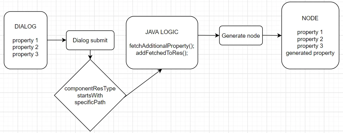 The end goal is to add a property to a node when the dialog is submitted. The property should ideally be fetched through Java logic and then added to the dialog properties on the generated node. This should happen for a set of components that have a similar resourceType (i.e. they are all in the same folder)