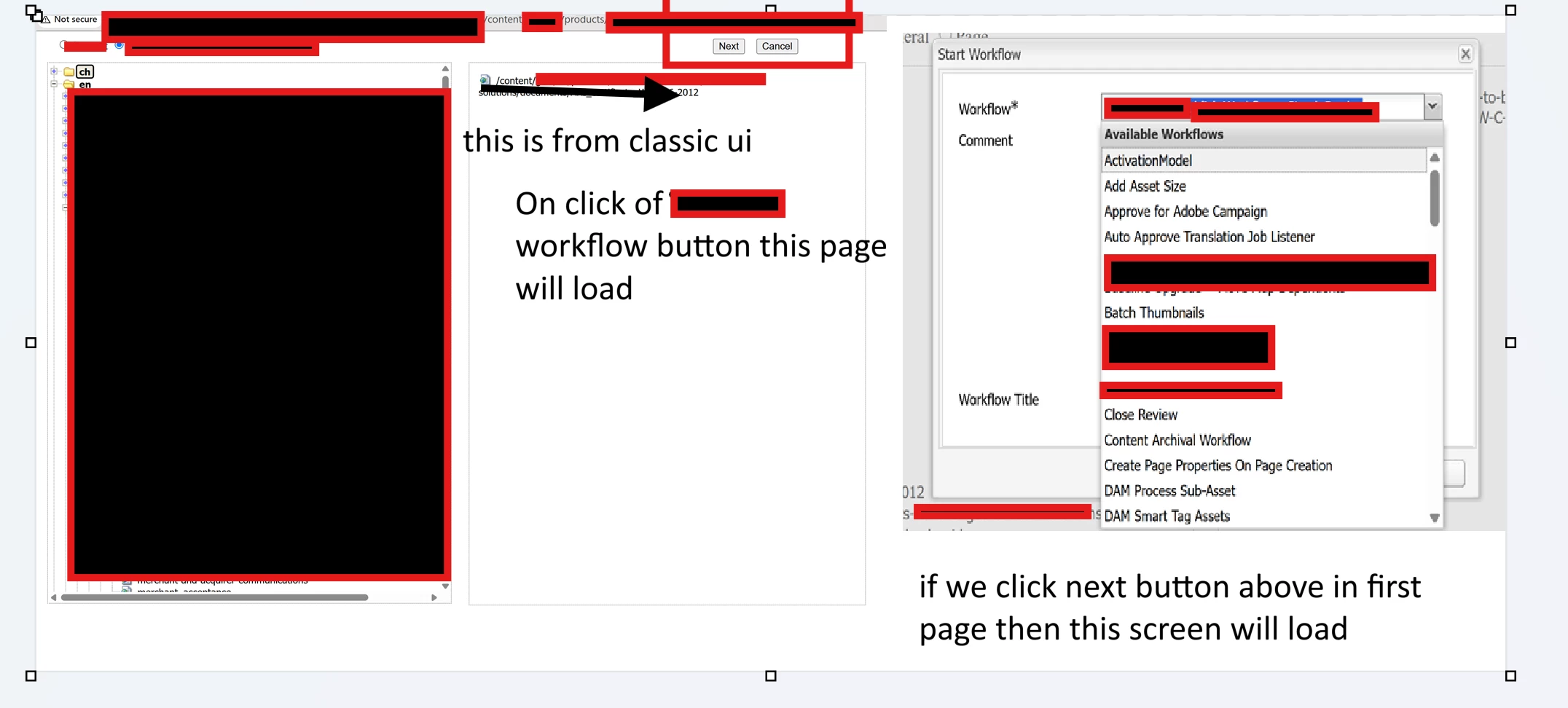 Hi AEM Community, I'm working on migration project , migrating from classic UI to touch UI. we have one button on siteadmin navigation bar called "start workflow" when clicked content tree dialog will open first where user where dialog will open with selected page(s) will show along next and cancel button if user selects next button then workflow model screen will load where model will be prepopulated.