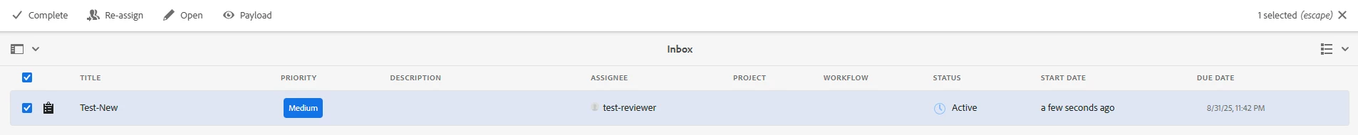 Now in inbox where we have the assigned tasks - there are some inbuilt options like "Complete", "Payload" etc that comes up when any workflow related task is selected. Refer to the following image for further clarity.