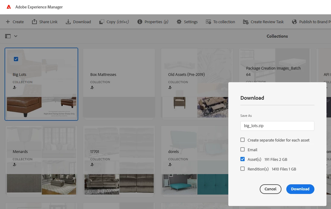 | Current/Experienced Behavior: | Currently we have to select all images within a collection for the dynamic rendition option to be an option for download. We also are getting an error when collections contain a 100+ images and we select dynamic renditions- so we then have to download these collections in smaller batches. |