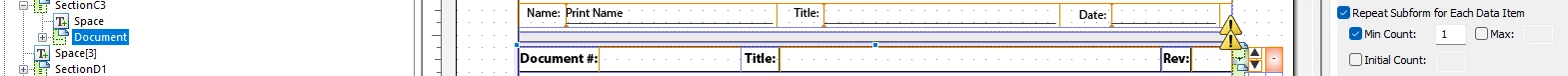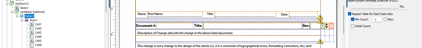I have this pdf form that has hidden subforms that appear when certain boxes are checked. I'm having issues with my Section C. subforms. I have add/remove row buttons, plus buttons that allow the user to rearrange the data within. As long as the subform is set to Visible, the add/remove buttons work. When it is hidden, the add row button does nothing and the remove row button will take away the only row visible (and it shouldn't do that).