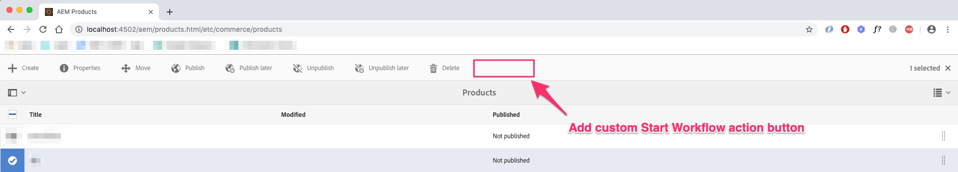 Add Start Workflow custom action to the action toolbar in AEM Commerce
