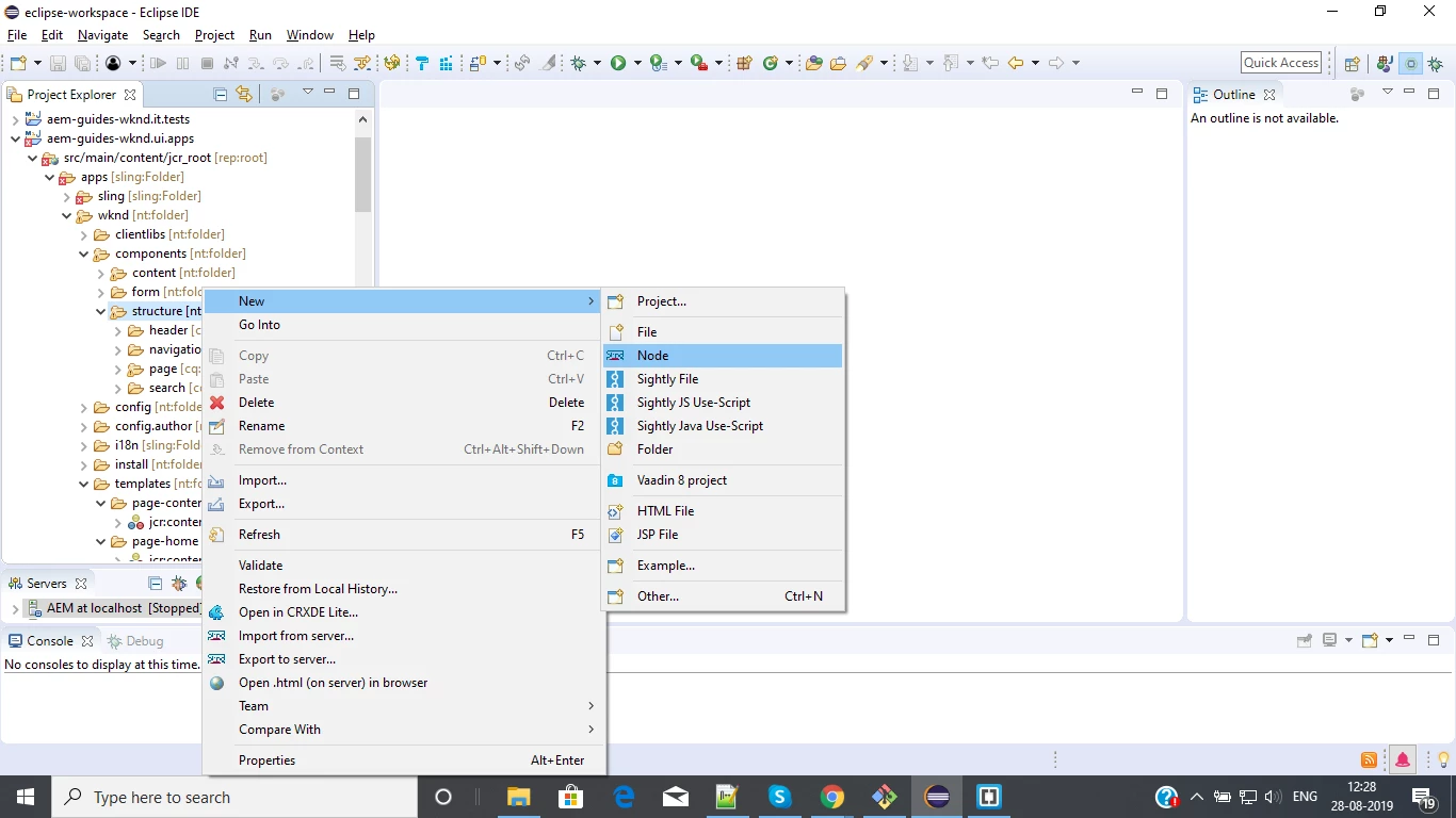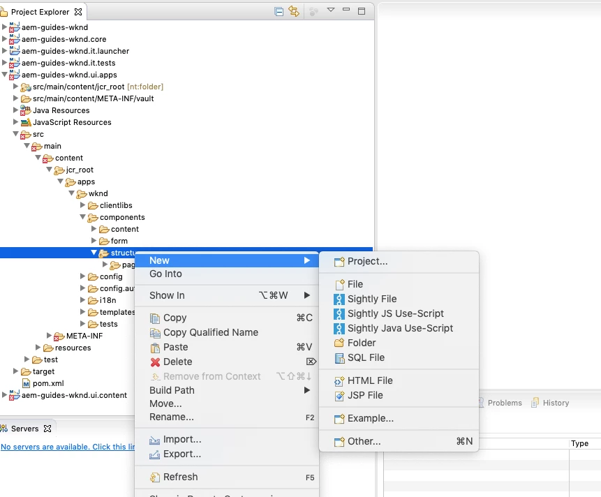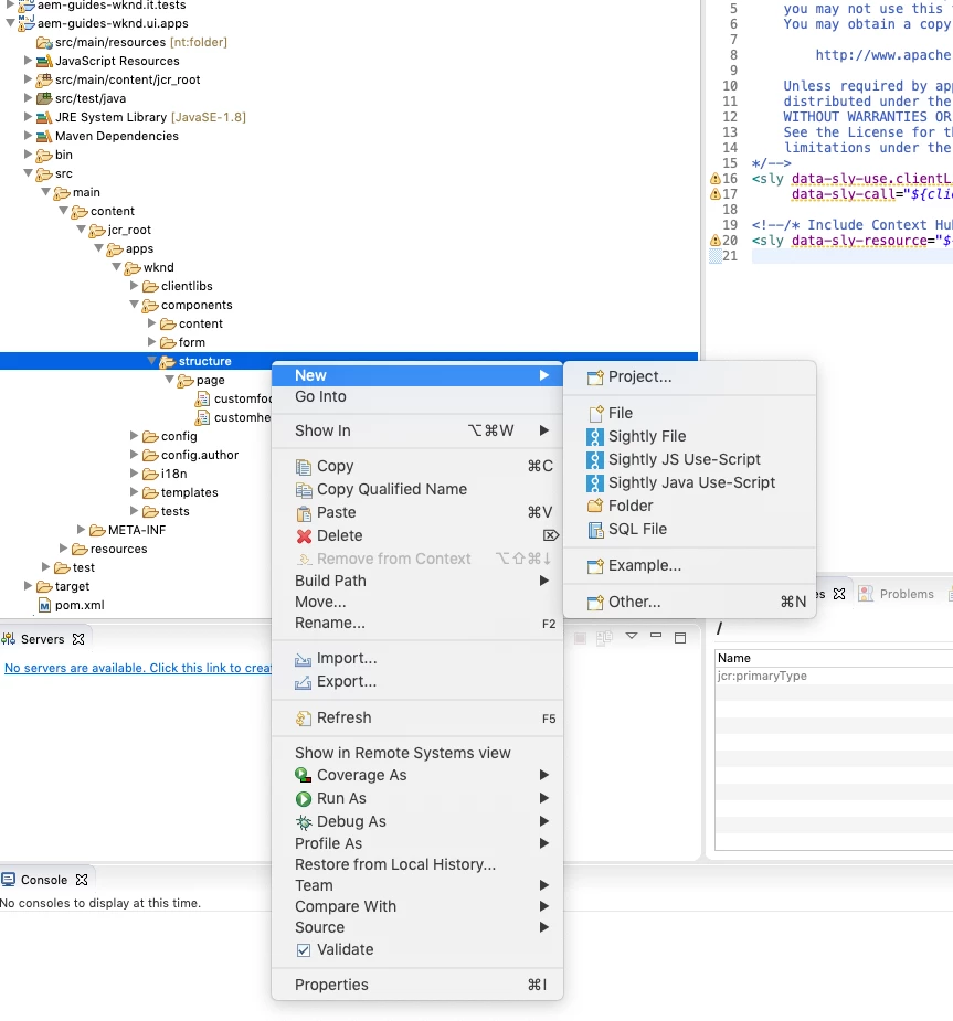 Hi, I'm following the WKND tutorial. On part 2, when adding a header component form Eclipse, I don't have an option to add a new node (right-click > new). Can anyone help here? Additional question, can I use Brackets or VS Code IDEs for this kind of tasks? Thanks.