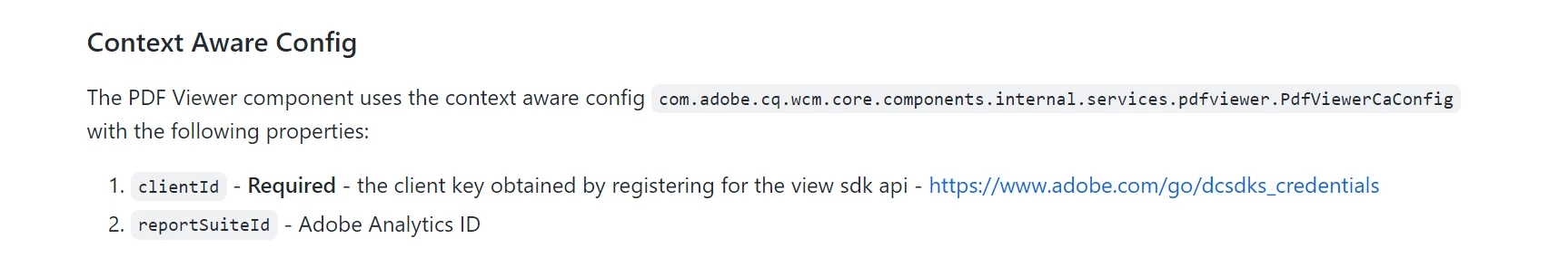 I want to use this PDF viewer core component but unable to author it as I need to add Adobe API Credentials to some context aware configuration.