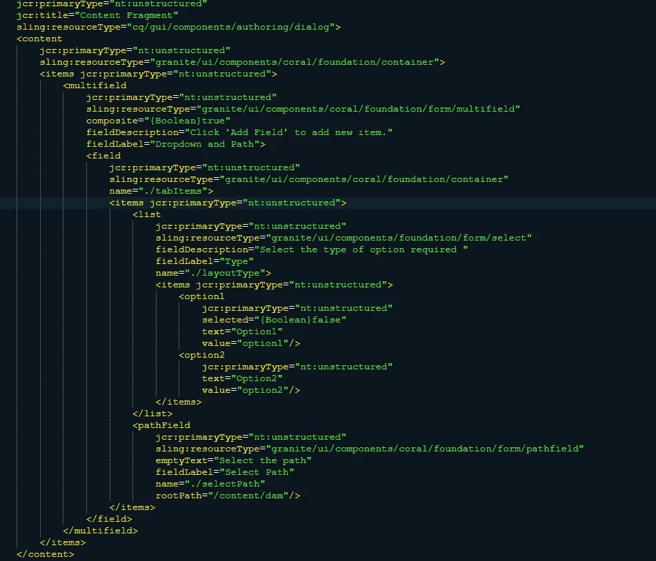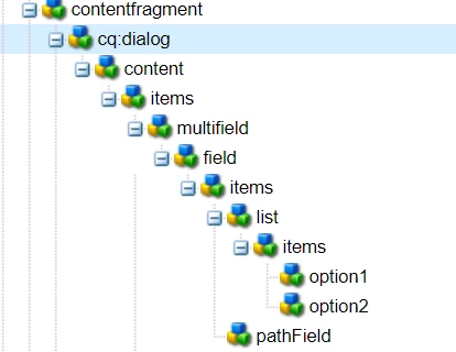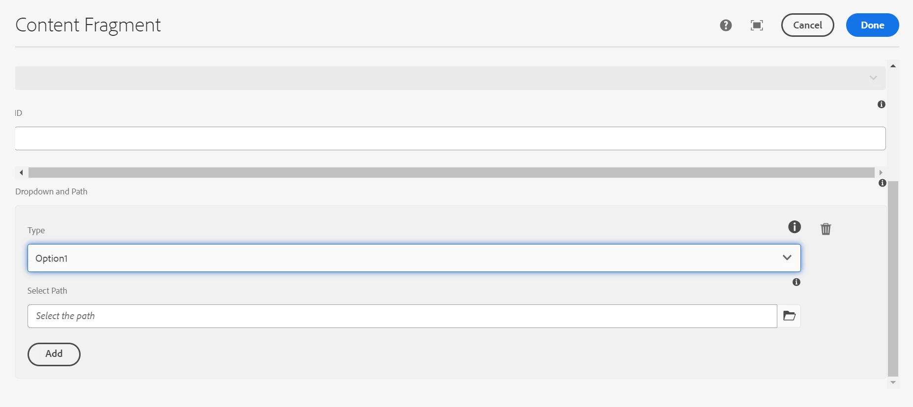 Adding the Multifield with dropdown and fragment path fields in OOB content fragment component