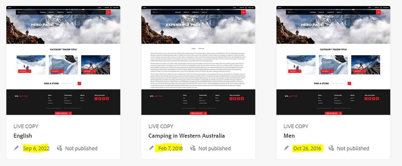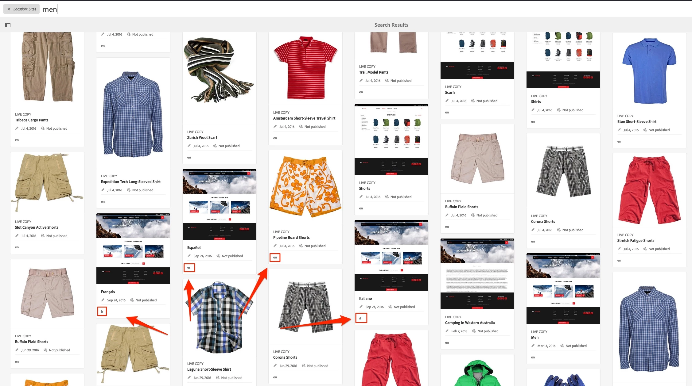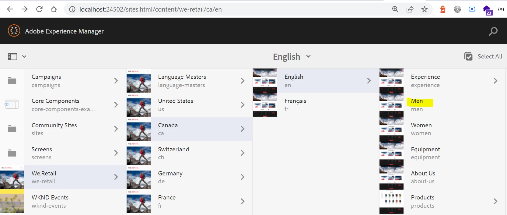 Likewise anither example if we search for Men page which is under we retails we can see it is in candan and us en as well.