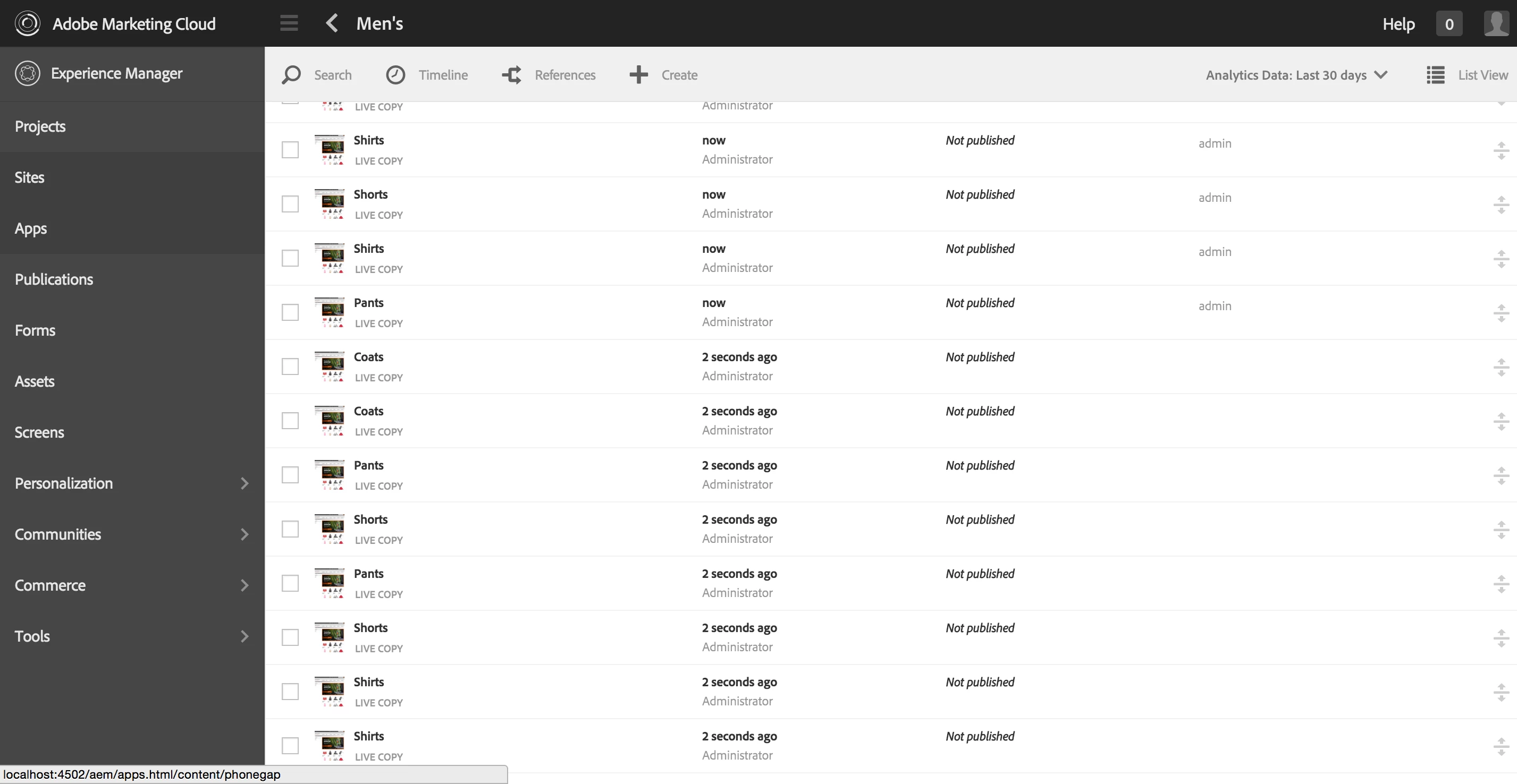 Once done navigate to http://localhost:4502/sites.html/content/geometrixx-outdoors/en/men and copy paste the items until you have more that 20. Scroll until more items are loaded and you will end up with this: