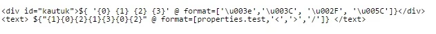 ${"{1}{0}{2}{1}{3}{0}{2}" @ format=[properties.test,'<','>','/']} - but its rendering in HTML as <test-data></contact-us>