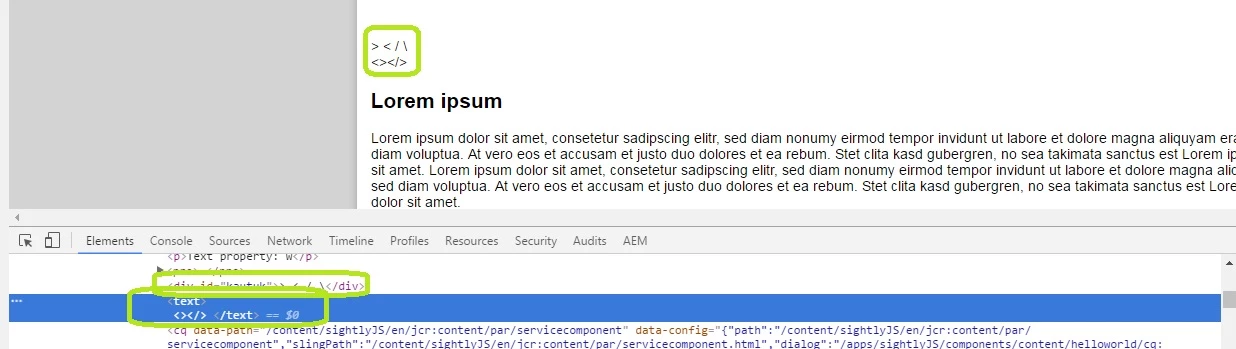 I want to escape chars like "<", ">" and "/" in sightly. I have this piece of code: