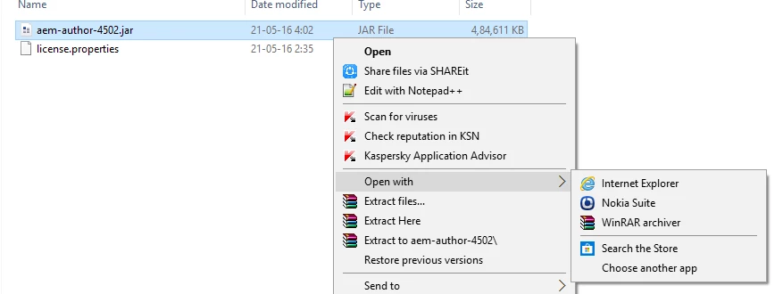 In order to fix this problem, you can right click on the quickstart jar file and in the context sensitive menu go to "open with" and select Java(TM) Platform SE binary. If this option is not visible in context sensitive menu, click "Choose Program" and browse to <Java_Home>\jre\bin\javaw.exe and select Java(TM) Platform SE binary. Then check “Always use selected program to open this kind of file” and click on OK.