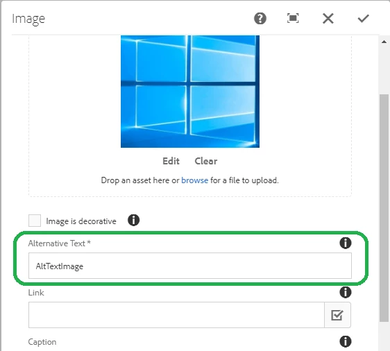 I am uploading an image in DAM. Now if I use the image on the component and view the page-source the alt-text property is not coming.