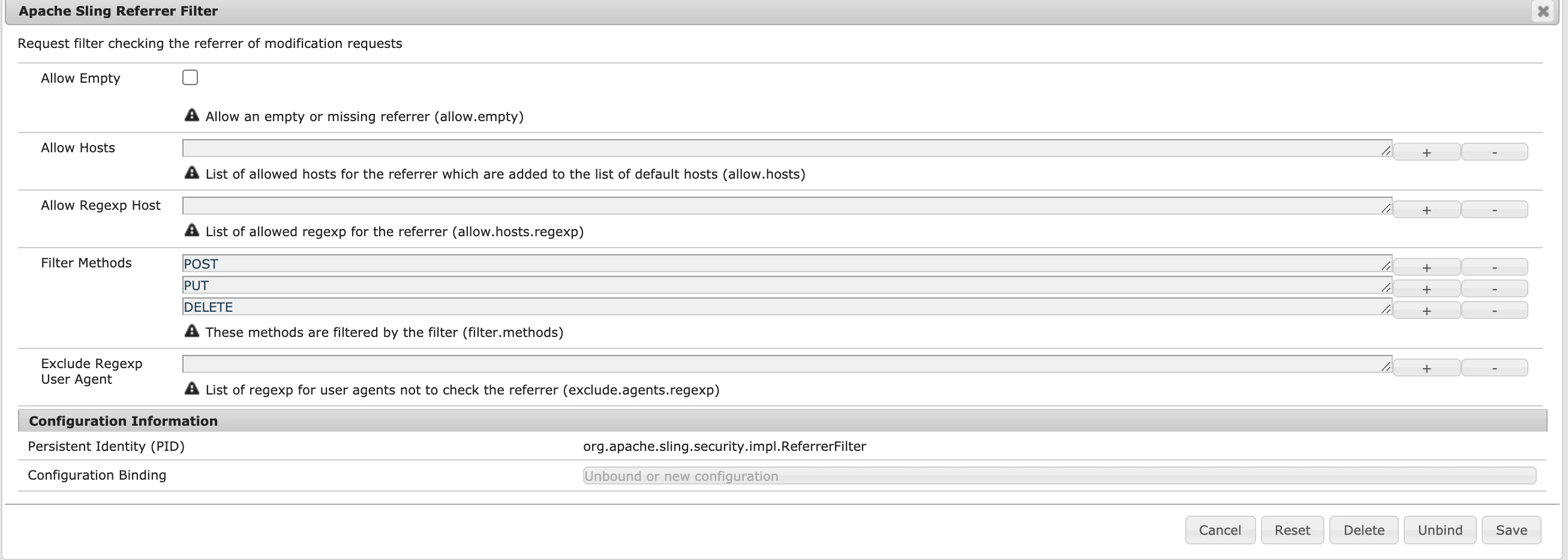 I have an HTML form inside an iframe that makes a POST request to an AEM servlet. The servlet path is excluded by the Adobe Granite CSRF Filter, and the host making the POST request has been added to the Allowed Hosts in the Apache Sling Referrer Filter. On AEM 6.4.8.0, everything works fine, however when upgrading to 6.4.8.1, the POST request returns a 403 Forbidden response. This is on an Author instance. The following message is seen in the Error log after making the request: