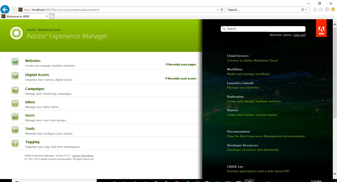 AEM 6.4 IE11 siteadmin empty Page
