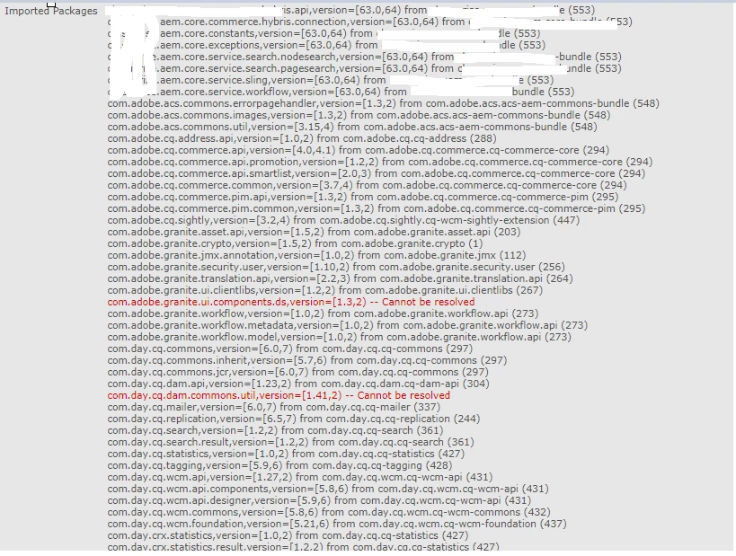 In AEM 6.4 after installing my bundle I'm getting cannot be resolved error for two packages . This is the same package it's working fine in AEM 6.1. Also I didn't explicitly mentioned any versions as captured in the below screenshot. can some one help me to resolve this?