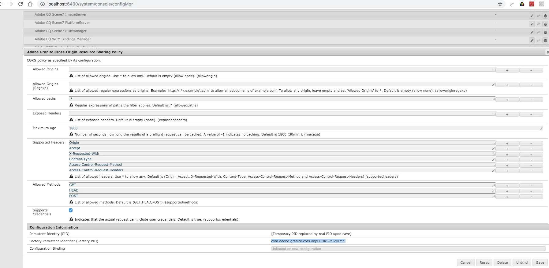 But this does not seem to work (anymore). If we follow the guide and add it to your package and deploy it again. It does not recognize it as an instance of the CORS configuration factory component.