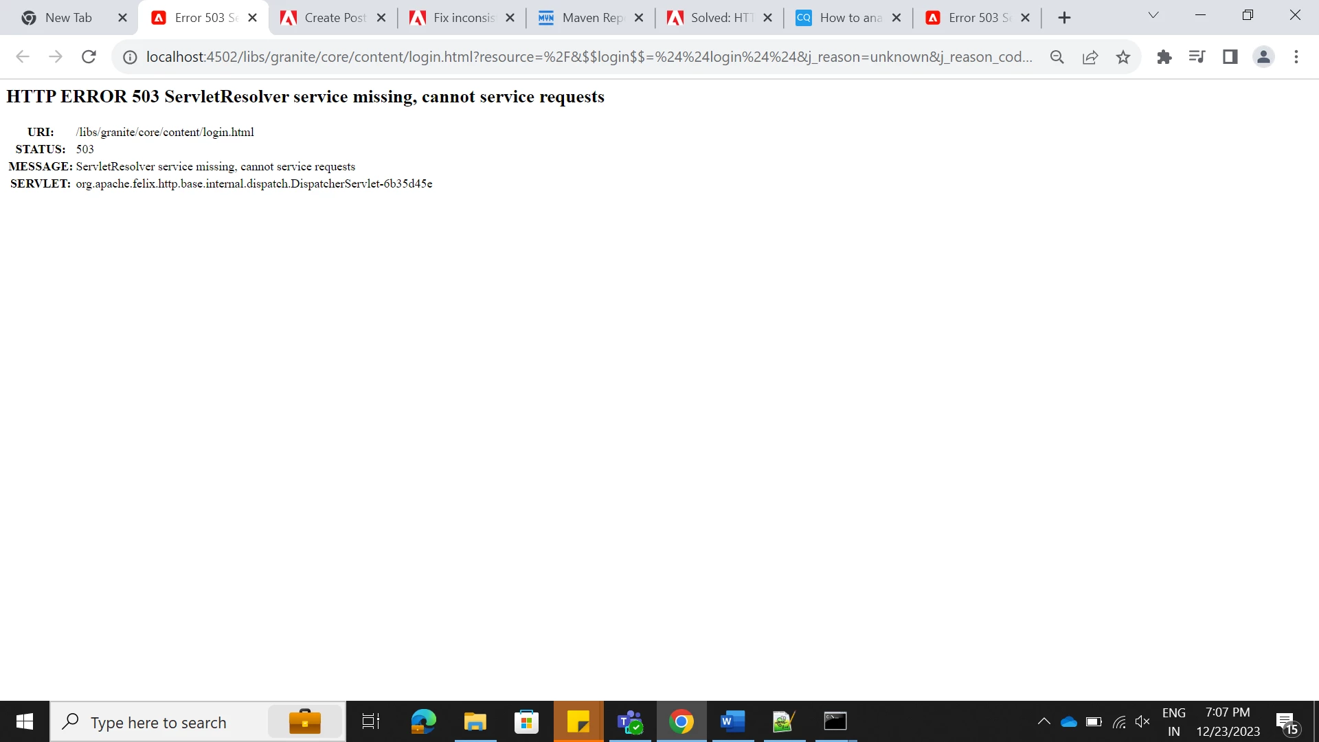 23.12.2023 18:55:20.806 *ERROR* [[0:0:0:0:0:0:0:1] [1703337920806] GET /libs/granite/core/content/login.html HTTP/1.1] org.apache.sling.engine.impl.SlingRequestProcessorImpl ServletResolver service missing, cannot service requests , sending status 503