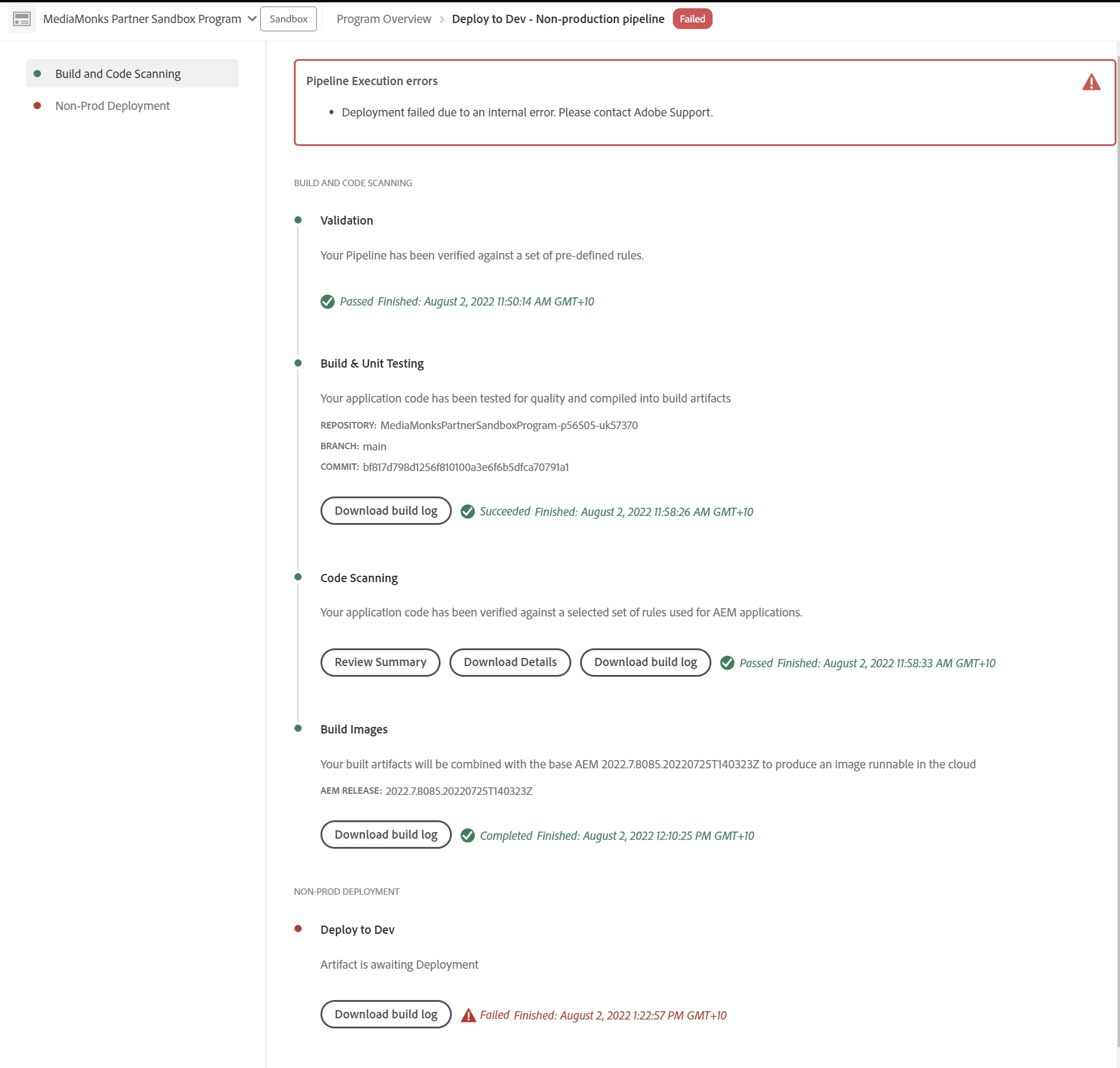 The error says "Contact Adobe Support" although as this is a partner sandbox, support is limited. Just logging the error here in case others come across something similar.