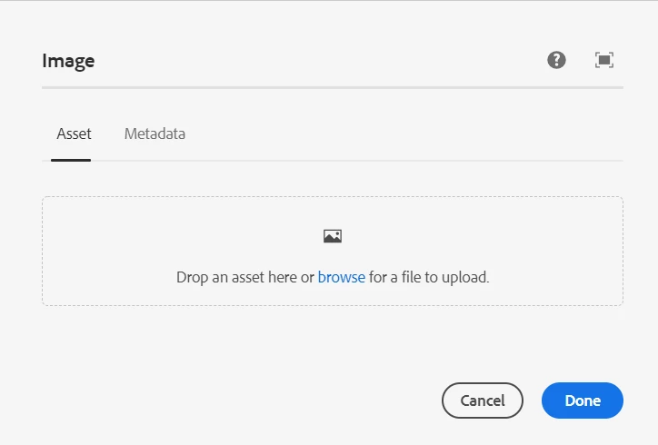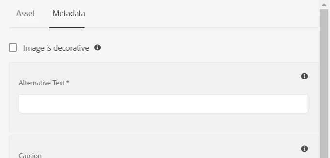 If you use the image component ( which is a proxy to the core image component) , it has mandatory fields in the Metadata tabs like below