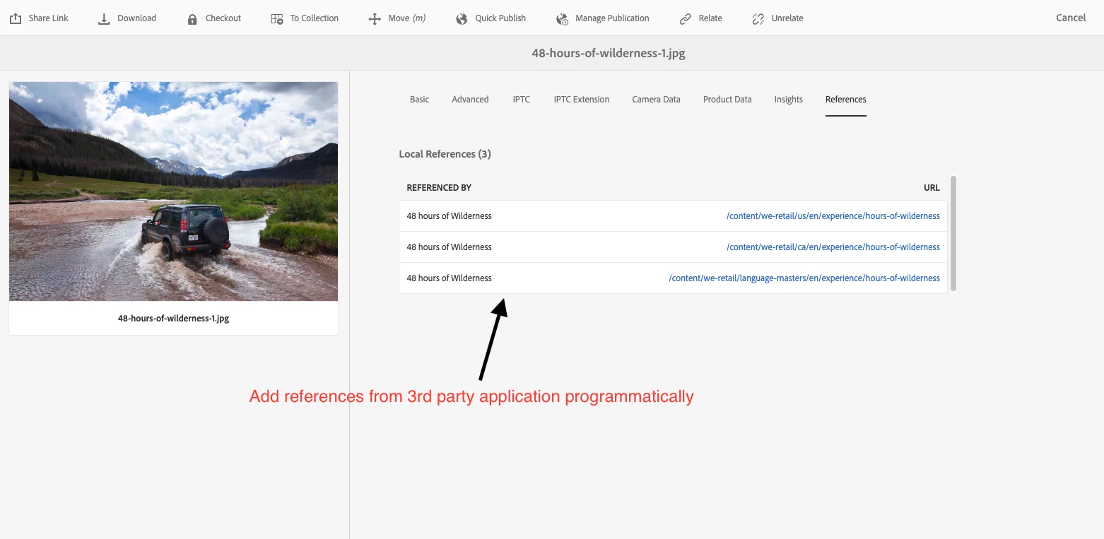 We were thinking to expose an endpoint from AEM which would hit by third part app. It would add references programmatically in AEM.