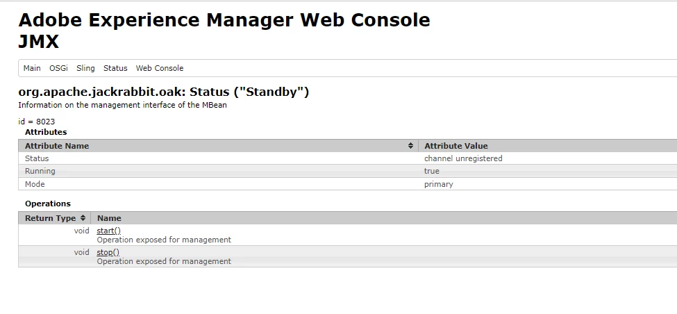 from jmx console I see the status at org.apache.jackrabbit.oak: Status ("Standby")