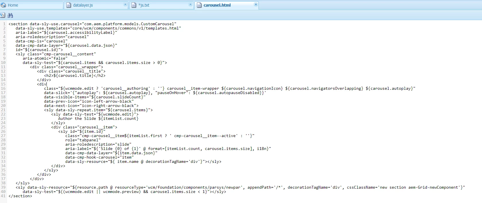 We have incorporated the slick slider (https://kenwheeler.github.io/slick/) in the html script for this component as shown below -