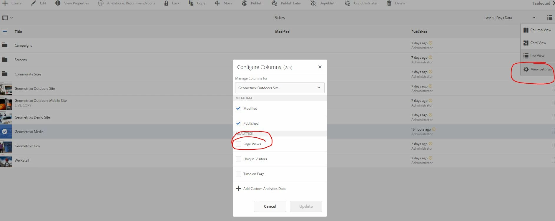 2. How do I get the analytics to show pageviews, unique visitors and time on page in the view settings in sites?