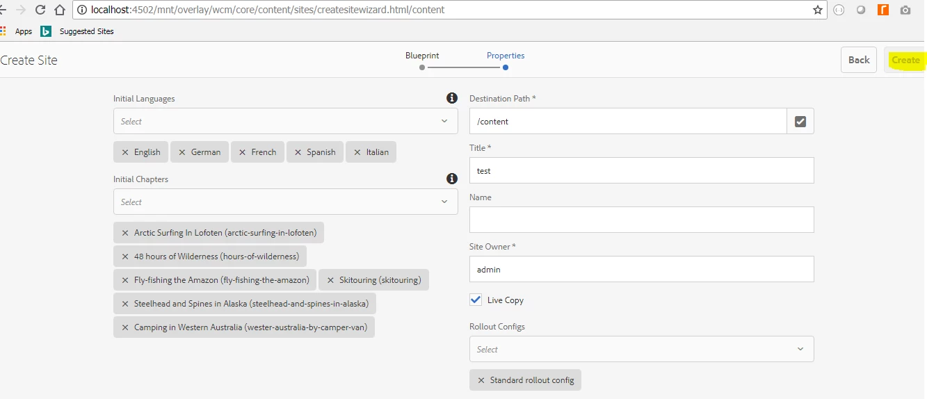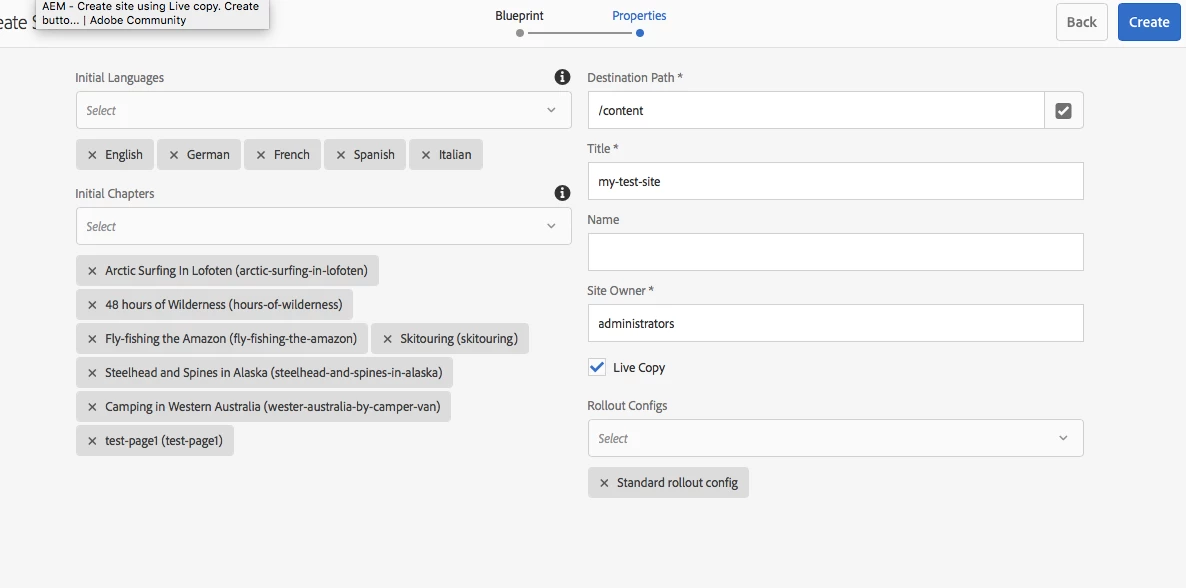 AEM - Create site using Live copy. Create button disabled
