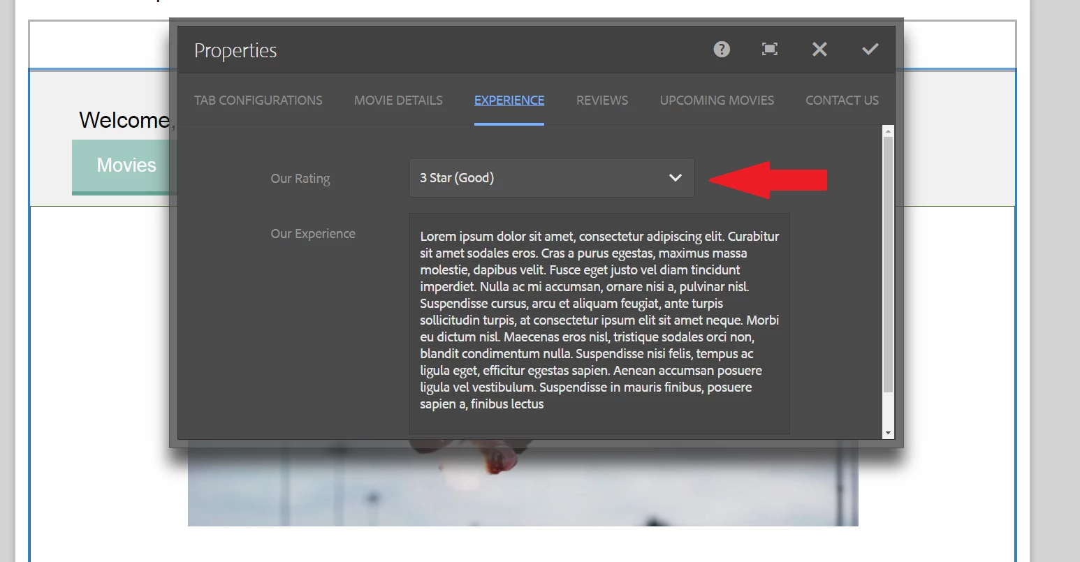 See this Movie component and the tabs - there are all sorts of fields on the dialog - including a drop-down,