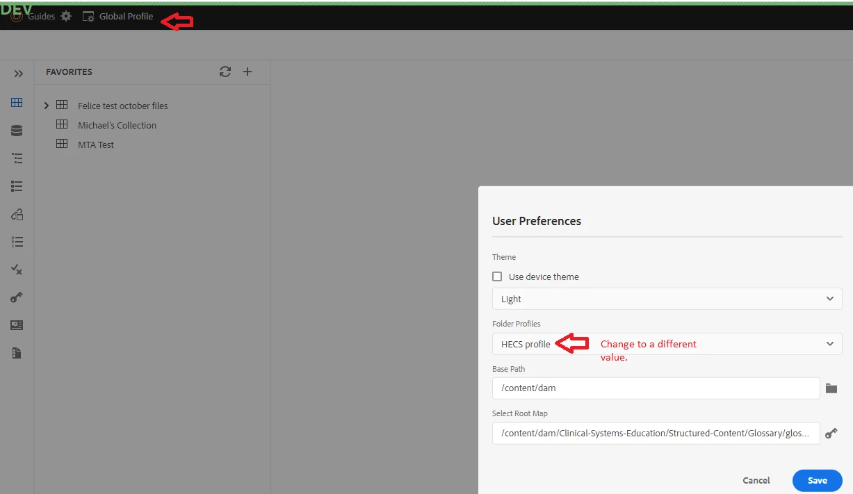 We have Adobe Managed Services AEM 6.5 with AEM Guides add-on 4.3. We're noticing that user preferences are not persisted across a user's session (e.g., pick a different Folder Profiles value and save, then exit Guides and come back in to find the default Global Profile selected). Is this the expected behavior, or should the preferences be saved for the duration of the session (or even across different logins)? Any thoughts as to why the changes are not being saved?
