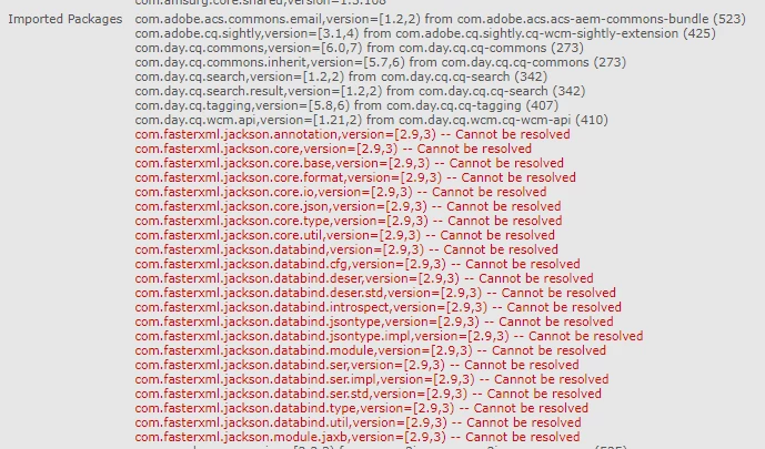 When I import this package and install into AEM, my bundle doesn't start and shows the below error, which basically says that all the dependencies for my 3rd party library cannot be resolved.