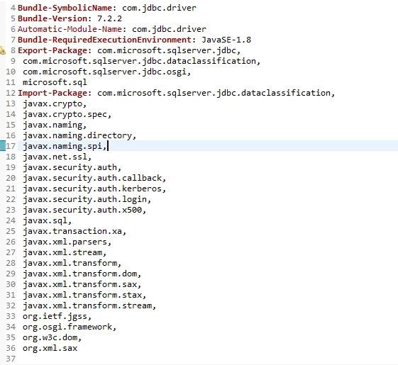I am trying to integrate Microsoft SQL DB with AEM. I have downloaded the Microsoft JDBC driver 7.2.2 and converted it to OSGI Bundle. I have also configured the JDBC connection pool. Now when am trying to connect to DB via a servlet am getting the below error. I have tried with different JDBC versions as well but no luck. Also below is the Manifest.MF file from my osgi bundle. Kindly let me know what might be causing the issue.