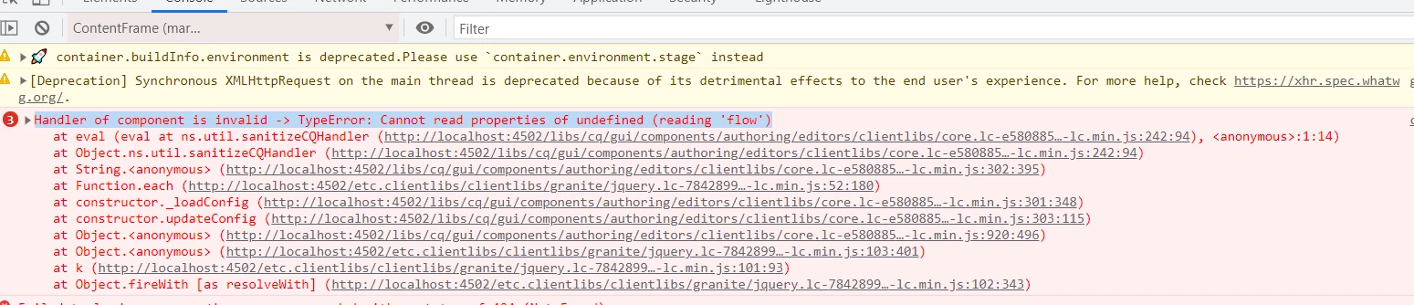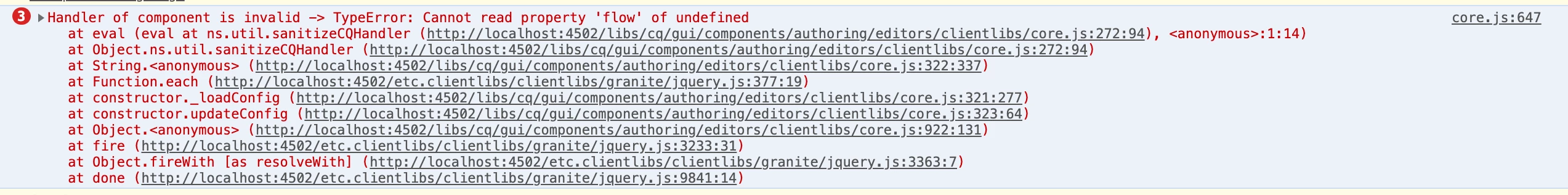 AEM Page Editor error : Handler of component is invalid -> TypeError: Cannot read property 'flow' of undefined