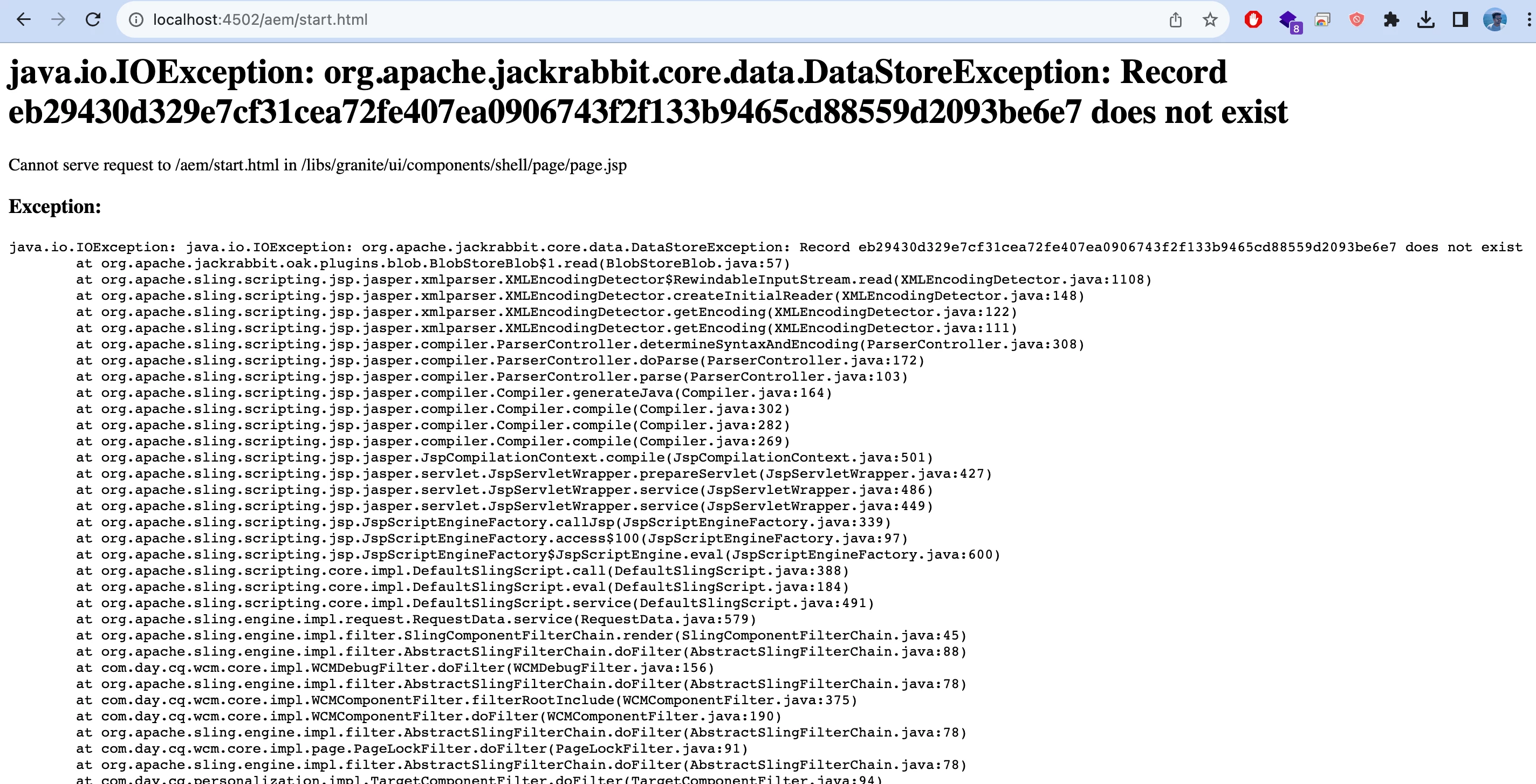 The error message you've provided, java.io.IOException: org.apache.jackrabbit.core.data.DataStoreException, typically indicates an issue related to the data storage subsystem in Adobe Experience Manager (AEM).