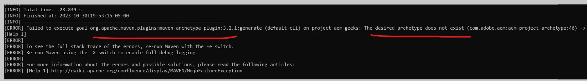 mvn -B org.apache.maven.plugins:maven-archetype-plugin:3.2.1:generate -D archetypeGroupId=com.adobe.aem -D archetypeArtifactId=aem-project-archetype -D archetypeVersion=46 -D appTitle="My Site" -D appId="mysite" -D groupId="com.mysite" -D aemVersion="6.5.17"