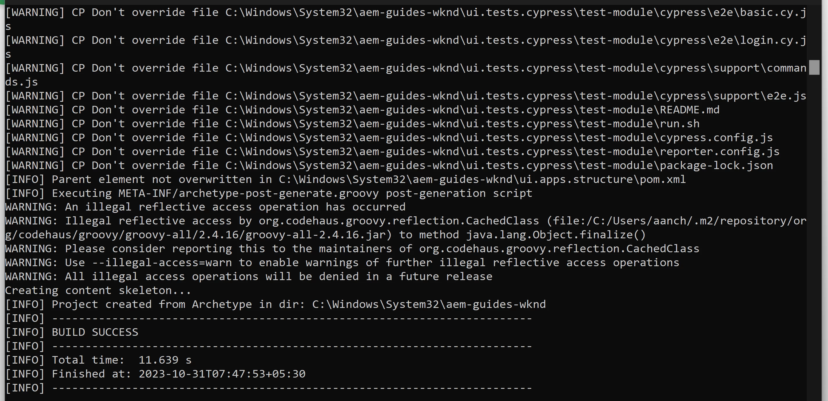 mvn -B org.apache.maven.plugins:maven-archetype-plugin:3.2.1:generate -D archetypeGroupId=com.adobe.aem -D archetypeArtifactId=aem-project-archetype -D archetypeVersion=44 -D appTitle="My Site" -D appId="mysite" -D groupId="com.mysite" -D aemVersion="6.5.17"