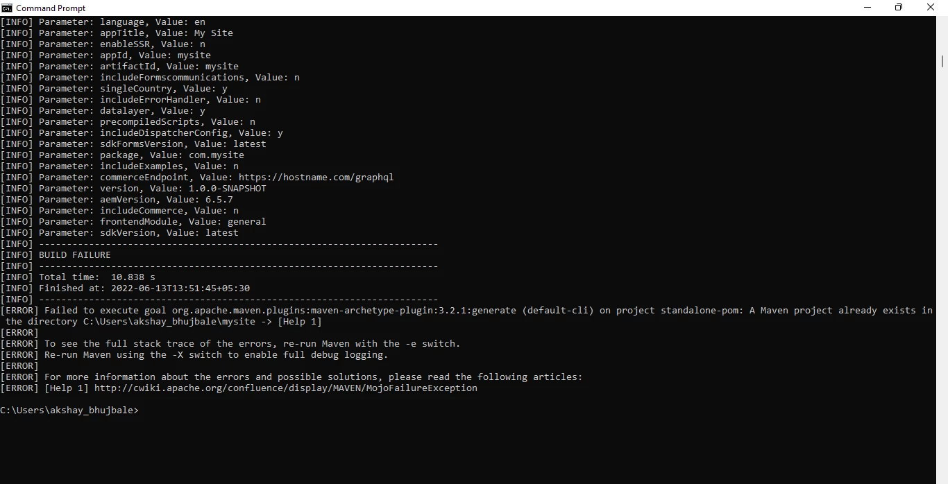 mvn -B archetype:generate -D archetypeGroupId=com.adobe.aem -D archetypeArtifactId=aem-project-archetype -D archetypeVersion=36 -D appTitle="My Site" -D appId="mysite" -D groupId="com.mysite" -D artifactId="mysite" -D version="0.0.1-SNAPSHOT" -D aemVersion=6.5.13 -D frontendModule=none -D includeExamples=y -D includeDispatcherConfig=n -D includeErrorHandler=y