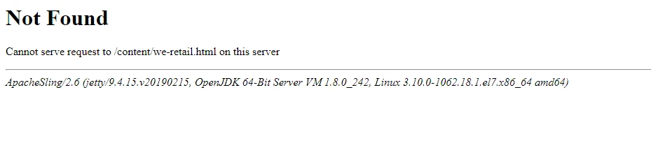 I have configured an AEM author and publish instance on two different servers and configured the replication agent and the connection is successful. After publishing the we.retail pages I am not able to view any pages on publish server. I get the following error:
