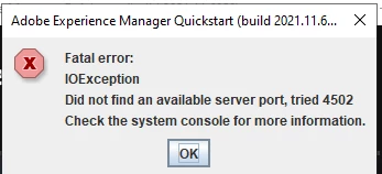 While i am trying to open aem jar file ,its throwing "did not find an available server port tried 4502"