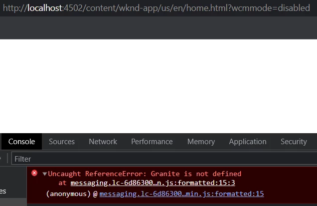 I am trying out AEM + React Integration and to achieve so, I created a page in AEM using Remote Page template. When I open the page in editor mode, I don't see anything rendering on the page (Not even the layout container). On inspecting the console, I see that there is an error --> ReferenceError: Granite is not defined. PFA the same. JS is getting called from remotepage component as below. <sly data-sly-call="${clientLib.js @ categories='cq.authoring.pagemodel.messaging'}"></sly>. Any pointers on this so that I can move forward ?