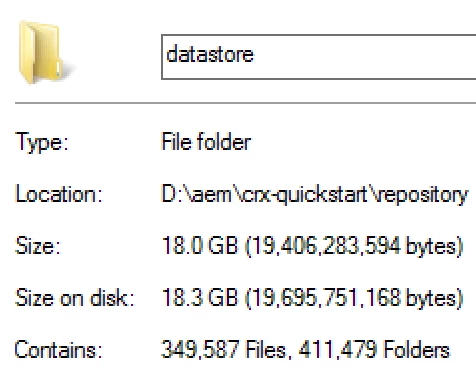 The datastore is by far our biggest folder. I was checking this out and from the AEM site itself, I deleted a bunch of sites and unused assets. So total on our site we have lets say ~5 sites with 10 pages and 20 images each. The datastore being so massive is confusing to me because when I check out the disk usage on our AEM server itself, it looks pretty small.