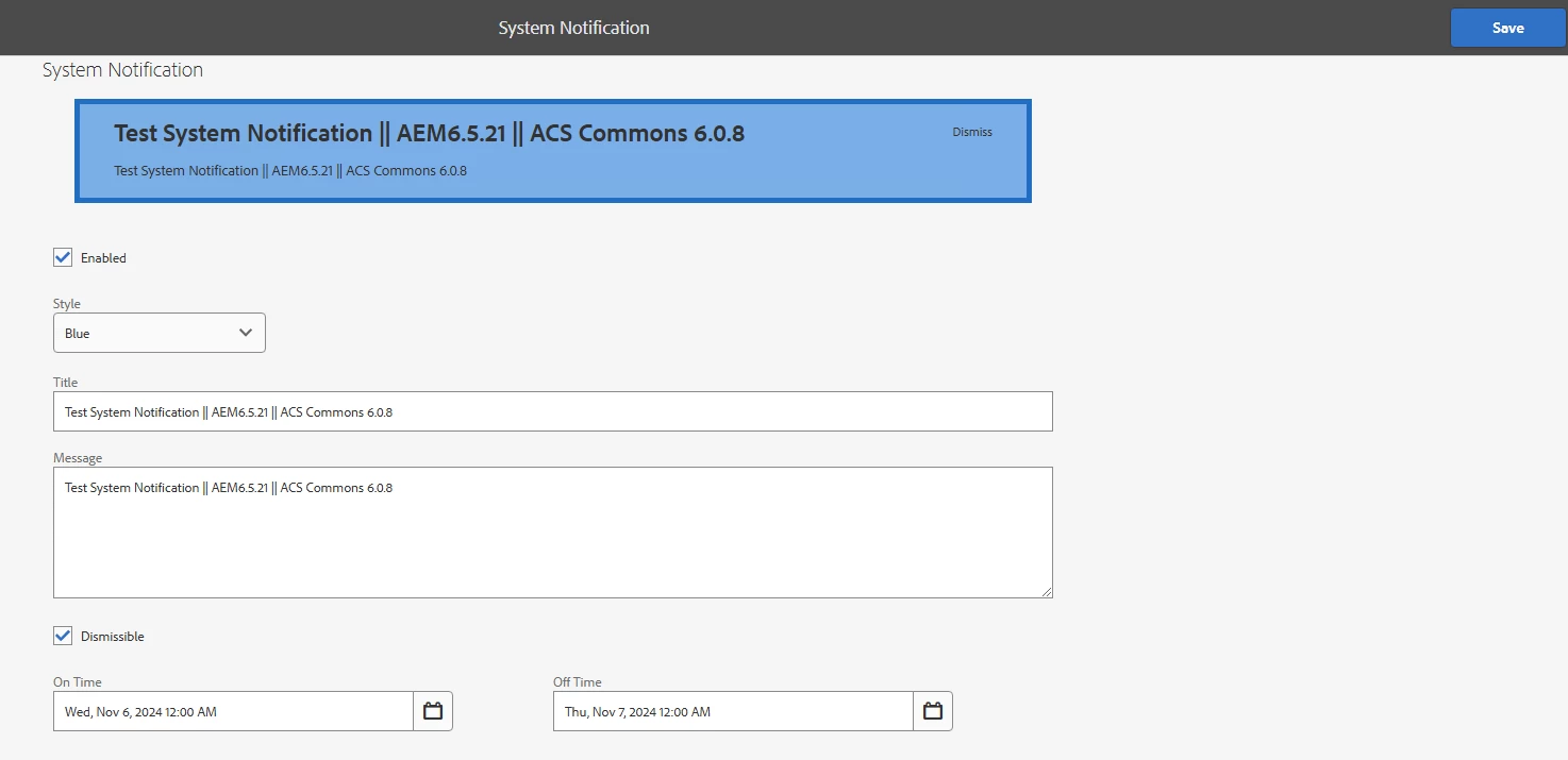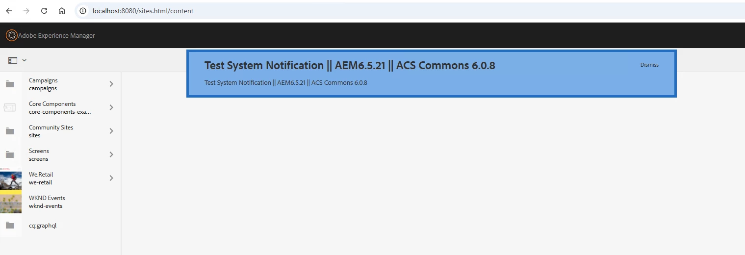 While clicking on the Dismiss button it should hide dismiss or remove the notification, but due to limitation in ACS Commons 6.0.8 [https://github.com/Adobe-Consulting-Services/acs-aem-commons/blob/e3be724e64d084c66e169efefcccc28d0f175d2a/ui.apps/src/main/content/jcr_root/apps/acs-commons/components/utilities/system-notifications/notification/clientlibs/notification.js] we cannot remove it forever,