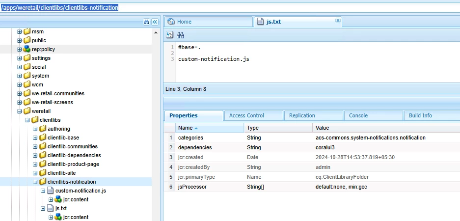 I need help invoking my custom JS to ACS Commons System Notification.